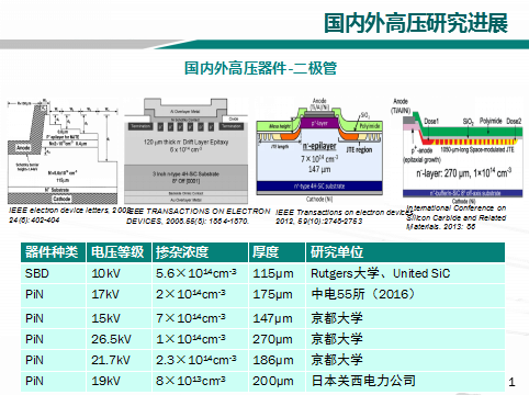 雖然在低壓領(lǐng)域SiC已經(jīng)進(jìn)入產(chǎn)業(yè)。但是在高壓領(lǐng)域,不管是國內(nèi)還是國外都還處于研發(fā)階段。由于材料的優(yōu)勢,國外的研發(fā)進(jìn)度要一些,日本京都大學(xué)在3年前就研發(fā)了26.5kV的PiN二極管,美國的Cree公司在也在3年前就研發(fā)了20.7kV的IGBT。國內(nèi)在引進(jìn)先進(jìn)的厚膜外延設(shè)備后,厚膜外延材料制備技術(shù)得到進(jìn)步,近也在高壓器件方面做了一些成績,比如中電55所在2016年報(bào)道了17kV 的PiN二極管,在2018年報(bào)道了12kV 的IGBT,說明國內(nèi)材料在一步步進(jìn)度,器件的差距也和國外漸漸縮小。