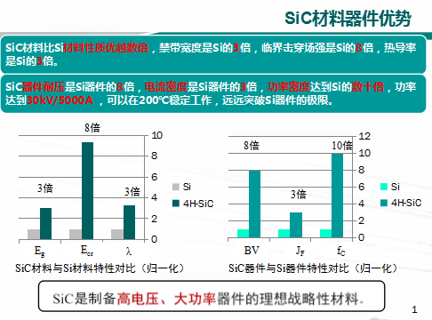 在電力裝備中電力電子器件是重要的部分之一,但是,目前電網(wǎng)輸送電壓500kV、800kV甚至達(dá)到1100kV,基本的電力電子器件,Si器件,已經(jīng)達(dá)到了由Si材料性能確定的極限,難以滿足智能電網(wǎng)的要求,更高電壓、更大容量、更高效率、更高結(jié)溫,亟需新型戰(zhàn)略性的材料器件體系。SiC材料的禁帶寬度是Si的3倍,臨界擊穿場強(qiáng)8倍,熱導(dǎo)率是3倍,材料性能優(yōu)勢明顯。SiC器件的耐壓是Si器件的10倍,電流密度3倍,頻率是Si的10倍,是制備高電壓、大功率器件的新型戰(zhàn)略性材料。